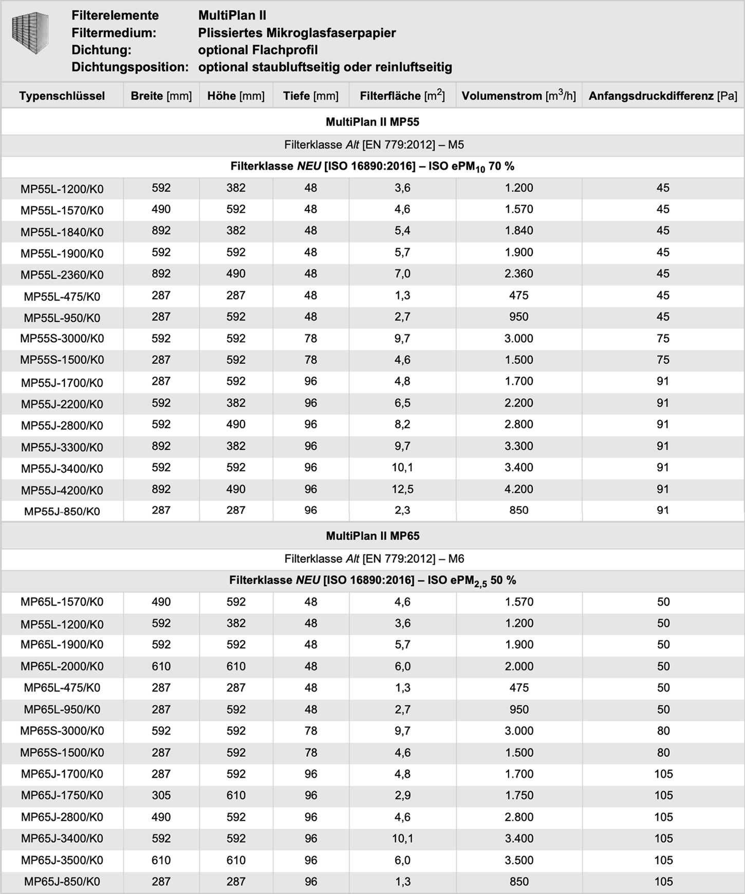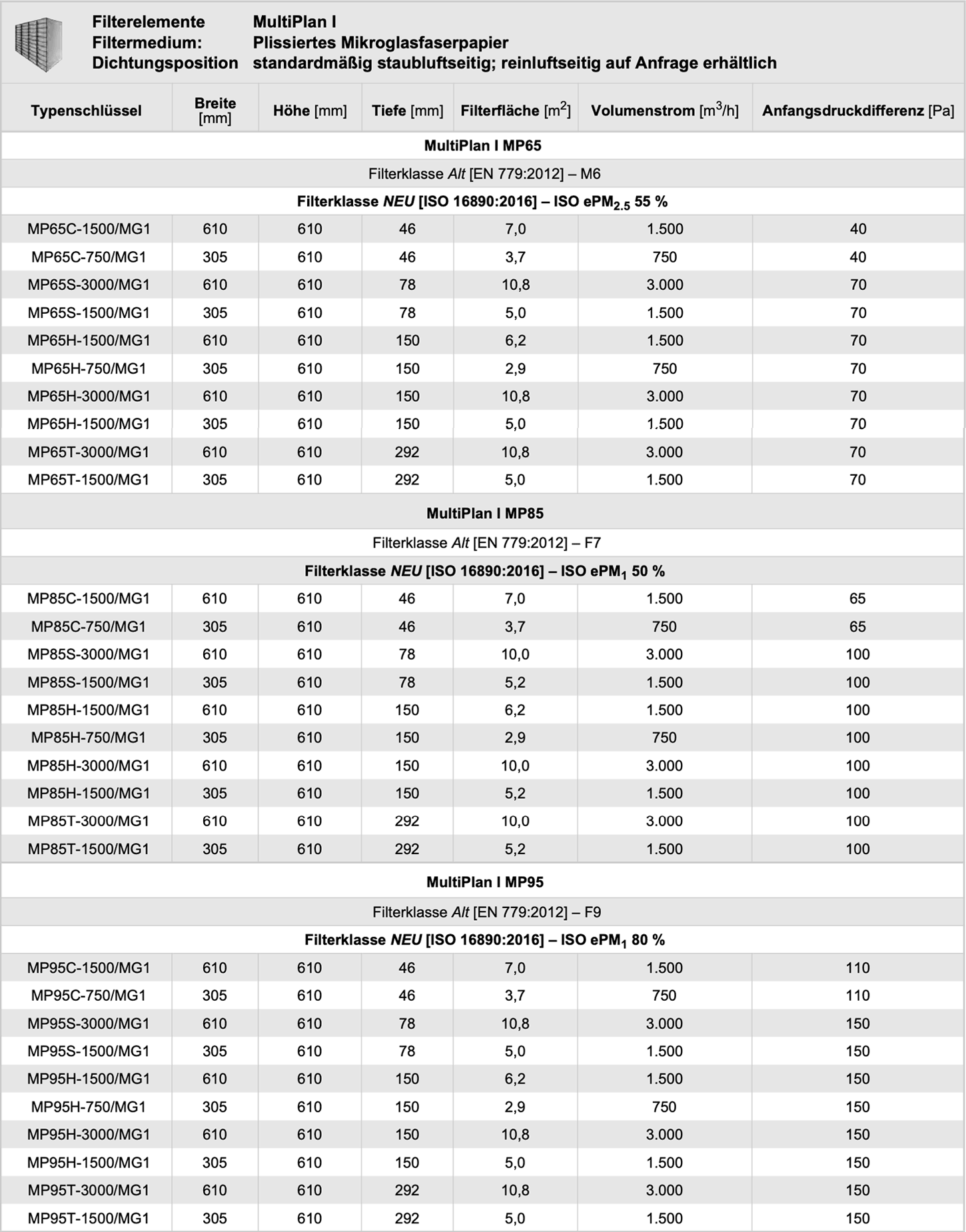 Filterklassen ISO ePM2.5 55 %, ISO ePM1 50 % und ISO ePM1 80 % nach ISO 16890:2016