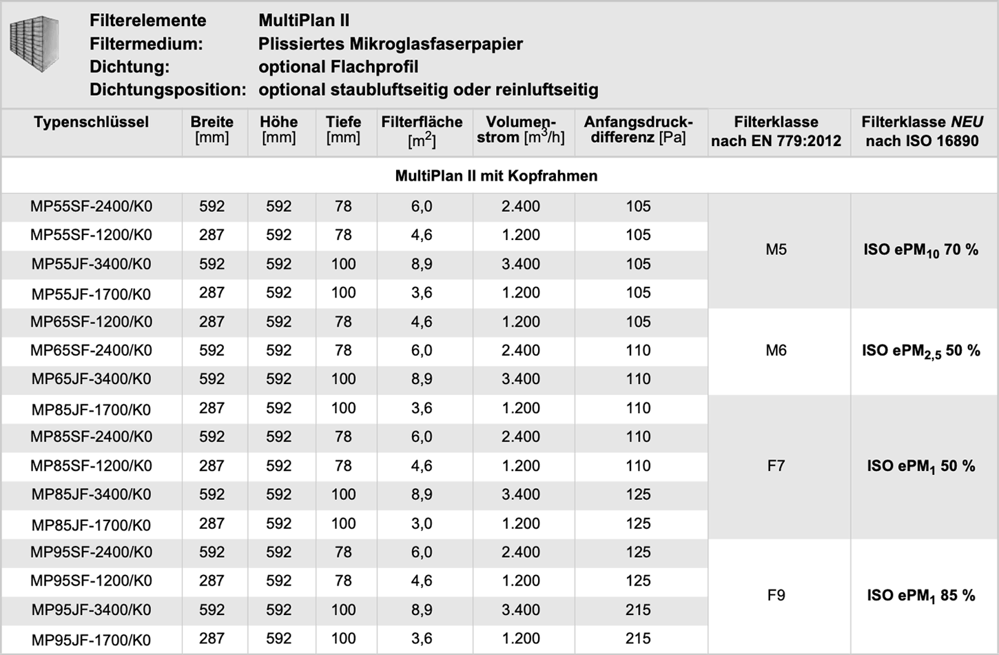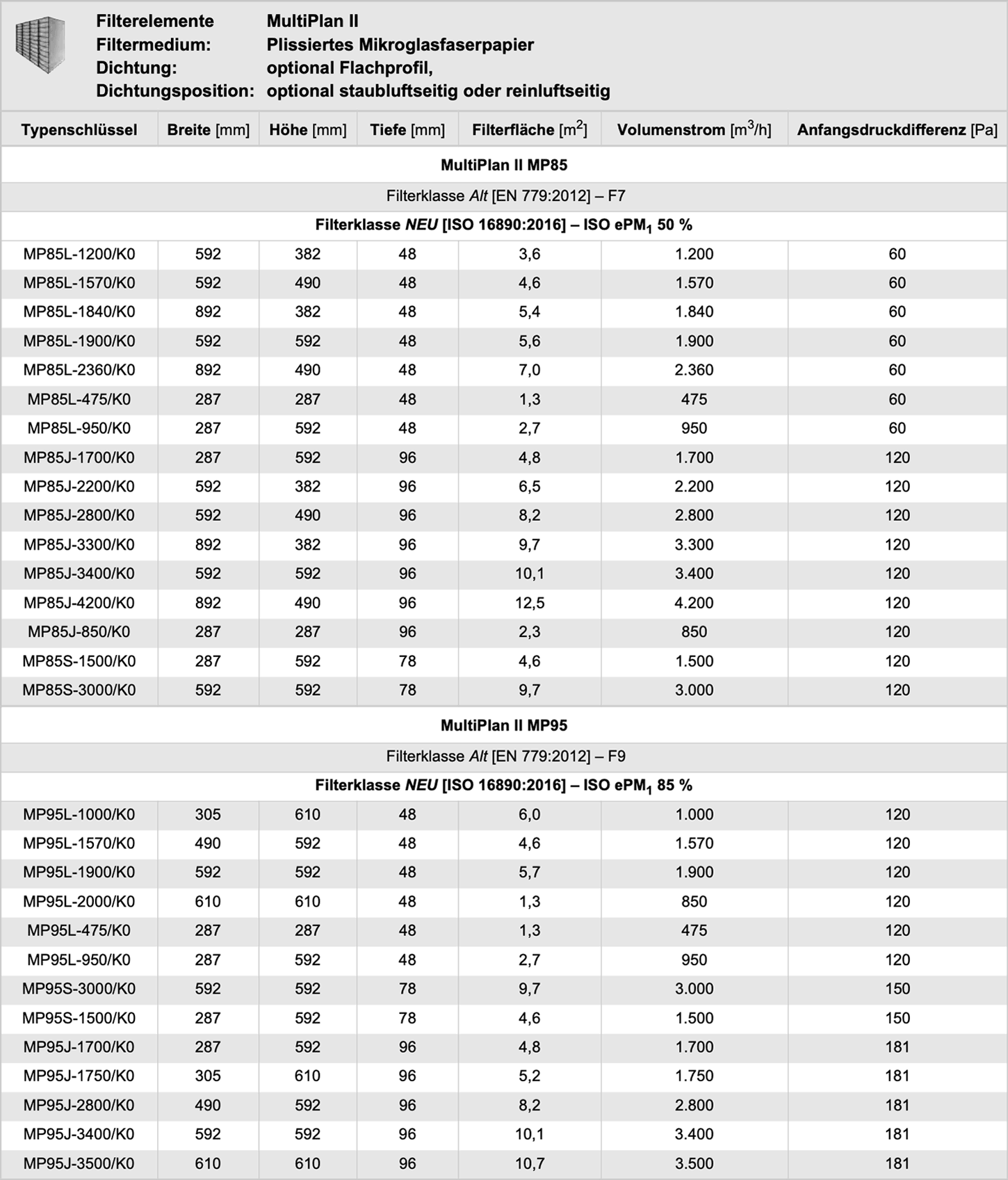 Die Filterzellen der Serie MultiPlan I bestehen aus einem Mikroglasfaservlies, welches nach neuester HotMelt Technologie gefalten wird. Das Faltenpaket wird in einem beschichteten MDF Holzrahmen angeordnet und mit Polyurethan-Masse vergossen. Die Filterzellen zeichnen sich durch eine hohe Staubspeicherfähigkeit und eine stabile Packbauweise aus. Die Filterzelle ist mit einer U-Profildichtung ausgestattet.